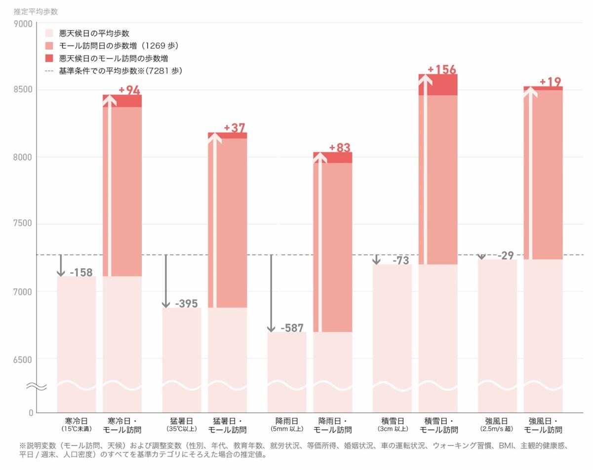 ショッピングモール訪問が悪天候日の歩数減少を抑制 ~ モール訪問で1,269歩の増加、悪天候日はより顕著な増加傾向に~