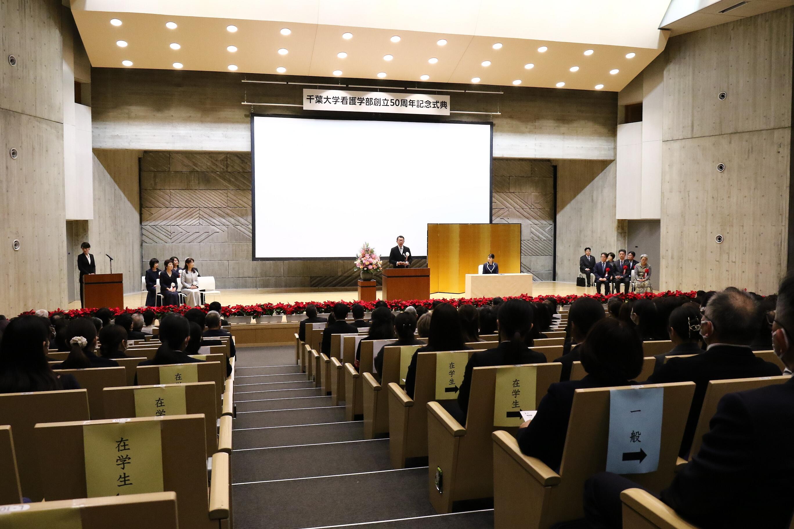 式典では、横手幸太郎千葉大学長および増島麻里子看護学研究院長・学部長より挨拶が述べられ、本学看護学部が歩んできた50年の歴史を振り返るとともに、今後の発展に向けた決意が示されました。