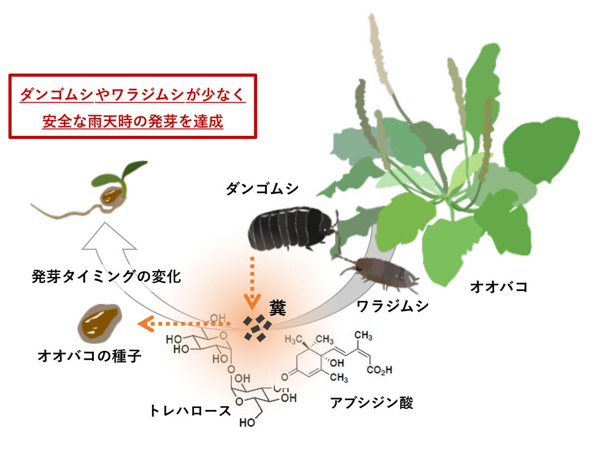 京都大学生態学研究センター、熊本大学大学院先端科学研究部附属生物環境農学国際研究センター、千葉大学大学院薬学研究院、名城大学農学部、森林総合研究所、理化学研究所環境資源科学研究センター、琉球大学熱帯生物圏研究センター、静岡大学農学部からなる研究チームは、多年生植物のオオバコの種子がダンゴムシの糞に含まれる化学物質を感知して発芽を一時的に止め、ダンゴムシによる食害を回避する仕組みを発見しました(図1)。ダンゴムシの糞中に含まれる「トレハロース」と「アブシジン酸(ABA)」が発芽を一時的に抑制すること、そしてそれらの成分が水で洗い流されると発芽が再開することが明らかになりました。さらに野外調査では、ダンゴムシの糞が存在する環境では、雨天時にオオバコ種子の発芽が集中し、ダンゴムシによる食害が起こりにくいことも確認されました。これらの結果は、オオバコの種子がダンゴムシの活動が活発な晴天時には発芽を抑え、活動が低下する雨天時に発芽を促すことで、食害を免れやすくなることを示唆しています。植物の種子はこれまで、光や温度などの環境刺激に応じて発芽時期を調整することが知られていましたが、本研究は、種子が植食者由来の刺激にも反応し、食害を回避できることを初めて明らかにしました。