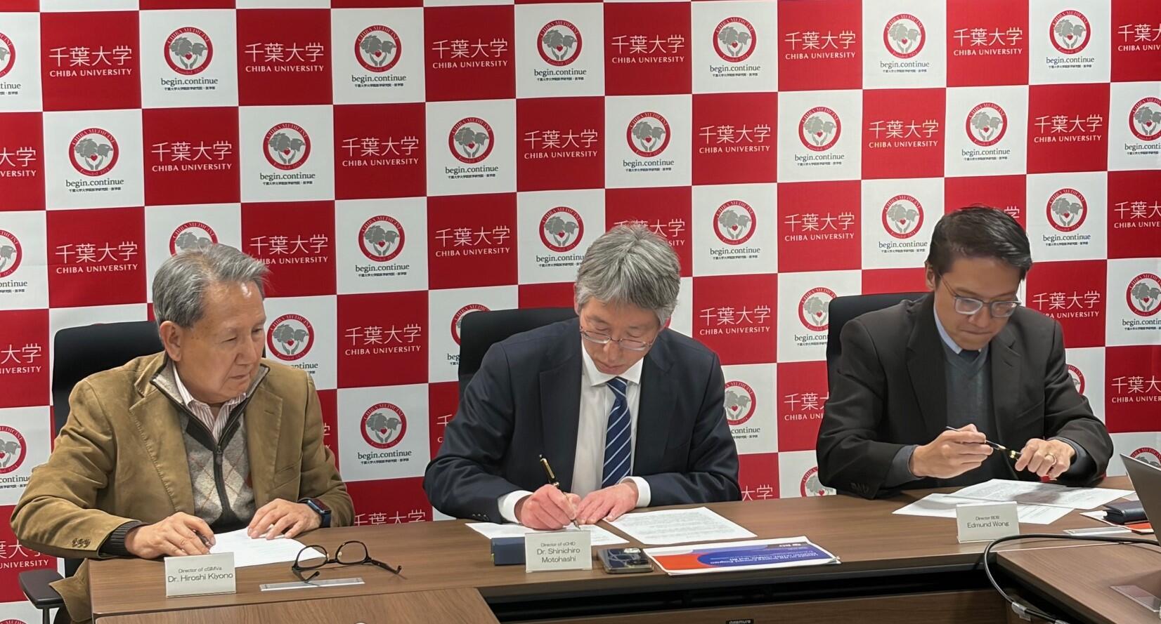 調印式の様子(左からcSIMVa 清野拠点長、cCHID 本橋センター長、日本BD Edmund Wong バイオサイエンス事業部長)